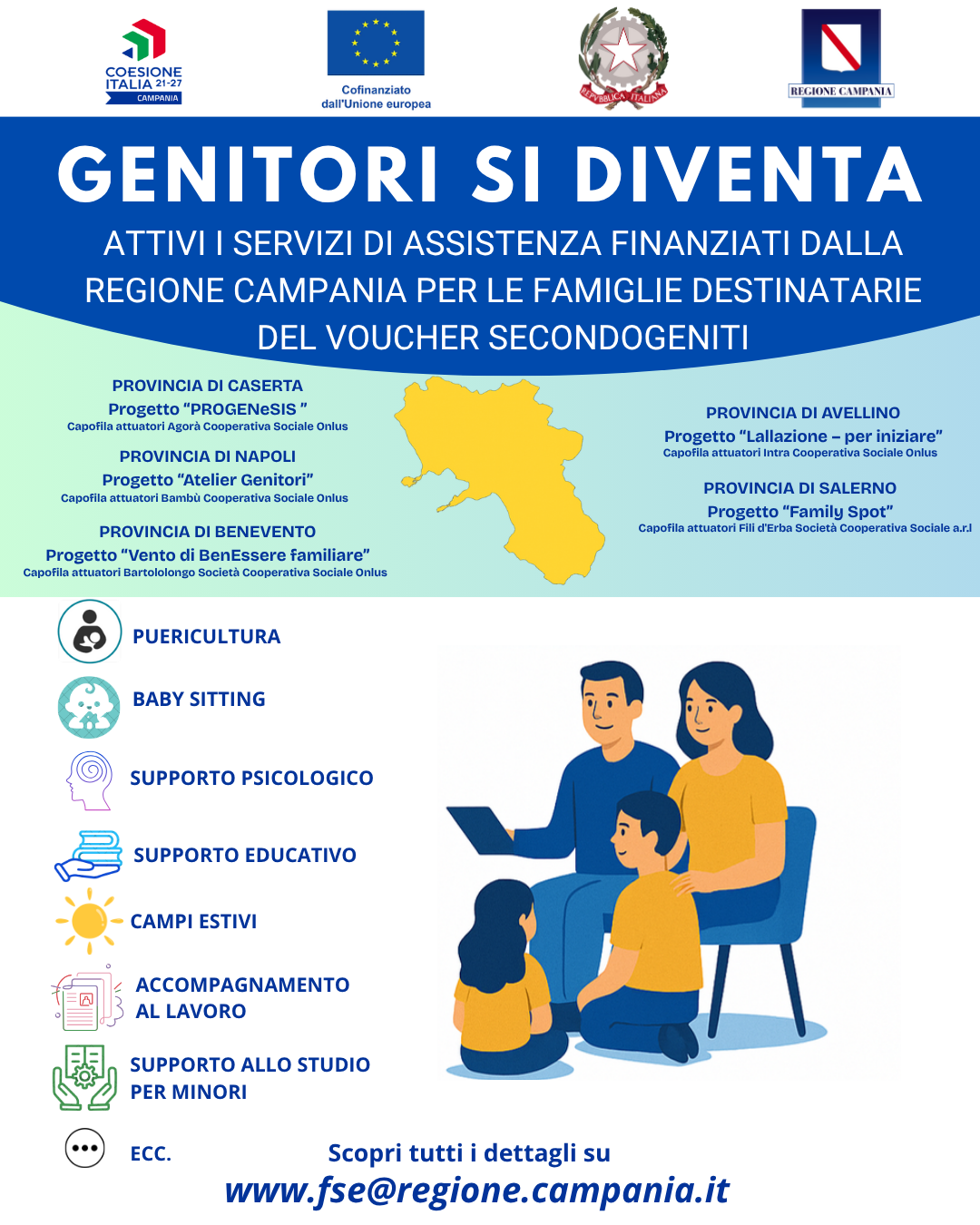 Le famiglie beneficiarie potranno inoltre usufruire di servizi di supporto alla genitorialità del progetto “Genitori si diventa”.